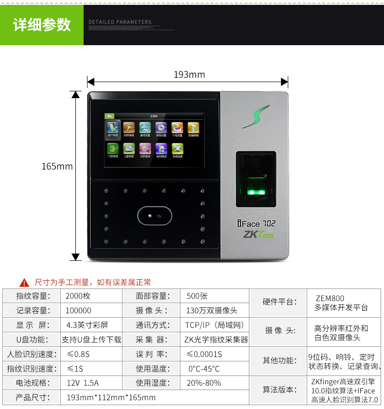 • iface702人臉混合指紋考勤機